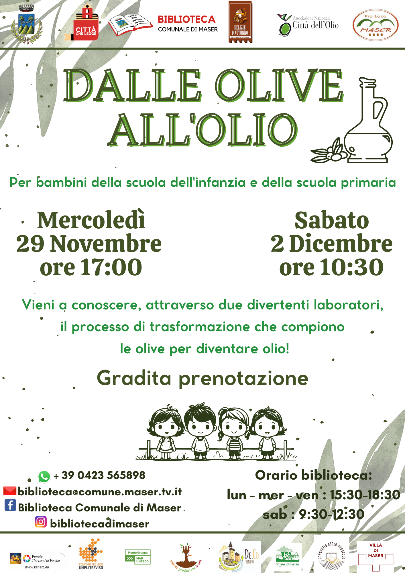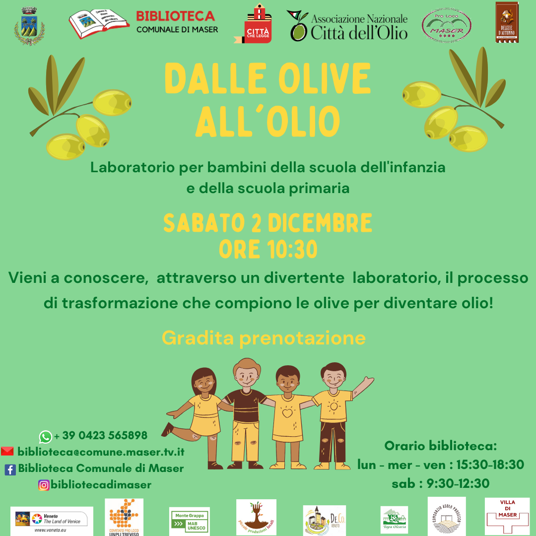La Biblioteca Comunale di Maser e la Pro Loco di Maser organizzano un laboratorio per conoscere il processo di trasformazione che compiono le olive per diventare olio.